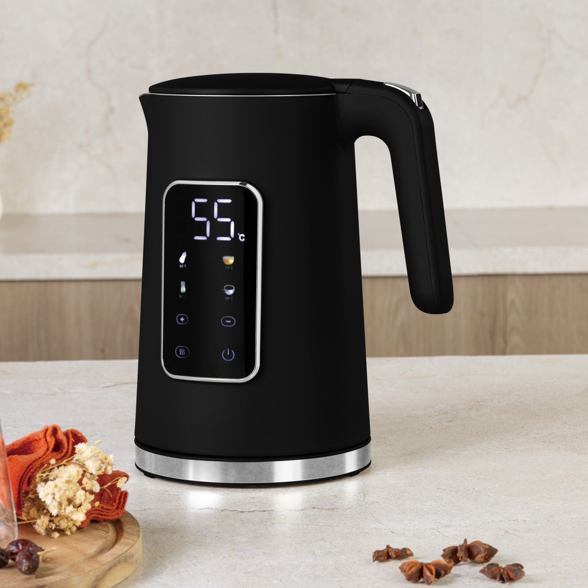 Konvice nabízí 4 přednastavené teploty (40 °C, 70 °C, 80 °C, 90 °C), digitální LED displej a 8 dotykových tlačítek pro snadné ovládání. Dvojitá stěna udržuje povrch chladný a bezpečnostní prvky jako automatické vypnutí a ochrana proti provozu na sucho zajišťují bezpečné každodenní použití.
